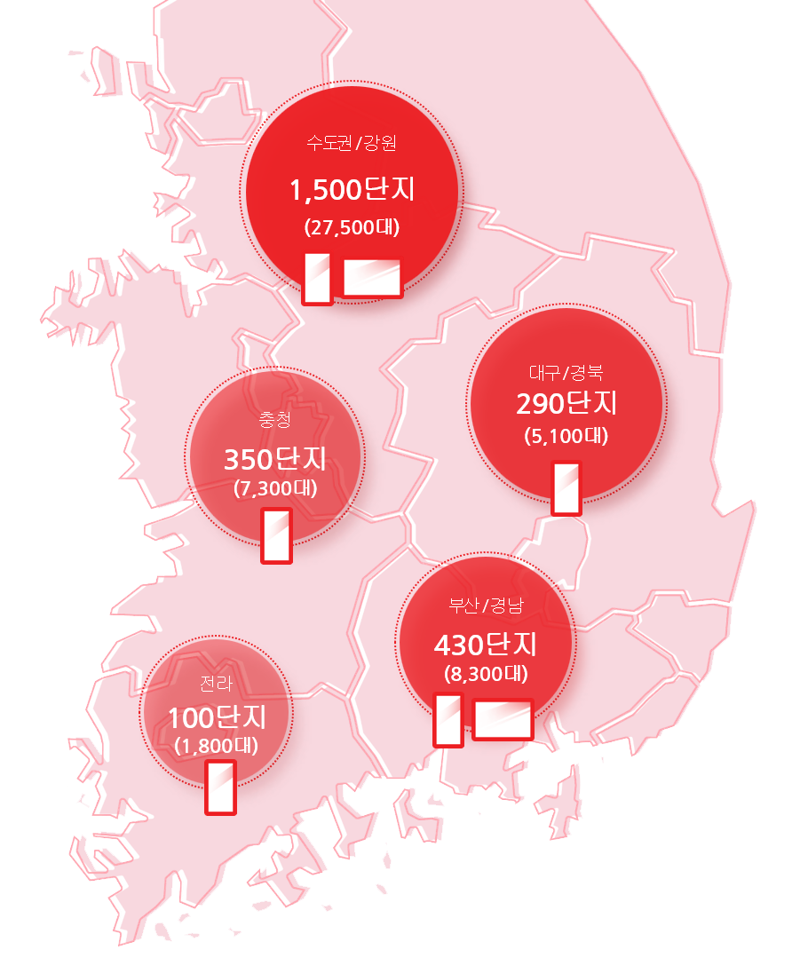 수도권 : 래미안원베일리, 서초그랑자이, 압구정현대, 잠실리센츠, 목동하이페리온, 광교아이파크, 광교더샵, 한강메트로자이, 송도더삽센트럴시티 등